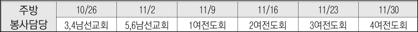 * 10월 주일 설거지 봉사 안내 : 주일 2부 예배 후 [(13시 50분까지), 3~5명 인원 필요]